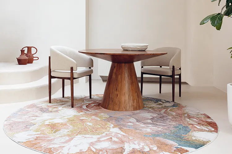 Stara je poslovica da ljubav ide kroz želudac, stoga romantična atmosfera počinje već u blagovaonici. Uz okrugli tepih predivnog cvjetnog uzorka stvorite moderan izgled inspiriran nježnim, romantičnim cvjetanjem prirode. Ovaj ručno tkan tepih u bež i pastelnim tonovima, izrađen je od visokokvalitetne mješavine vune i vrlo lako će transformirati izgled vašeg prostora. Skuhajte omiljeno jelo, upalite svijeće i započnite svoju romantičnu valentinovsku noć u blagovaonici koja nadahnjuje.